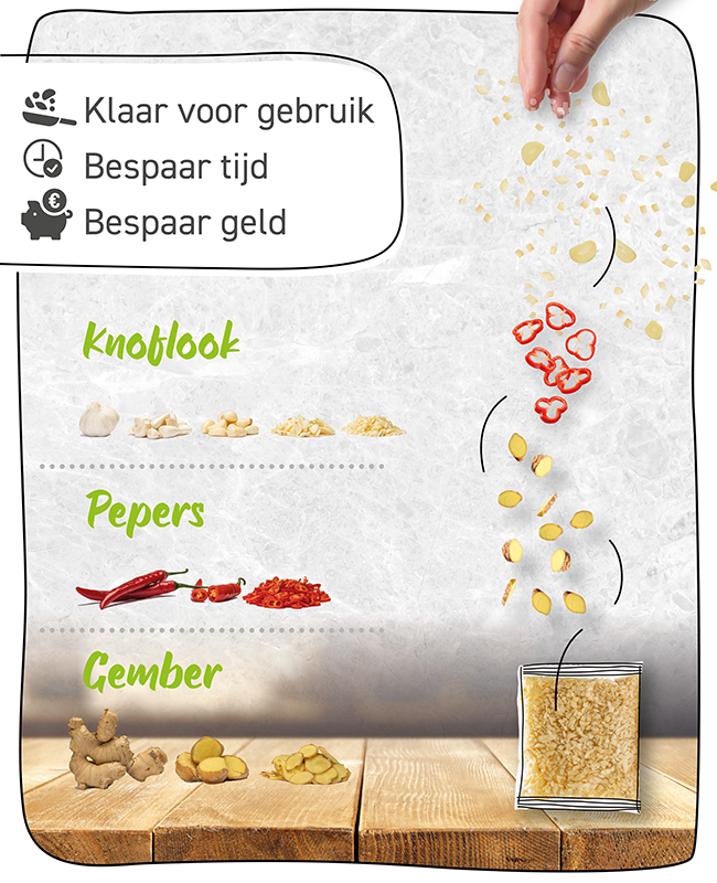 Garlic Solutions & More staat voor gebruiksgemak, verse,- en natuurlijke producten, kwaliteit en flexibiliteit. Onze gesneden gember, knoflook, rode pepers en Jalapeño pepers zijn dé smaakmakers voor de horeca. Wij beperken food waste tot het minimale door het leveren op maat. Klaar voor gebruik ofwel een schaar & klaar. Door onze wijze van verwerken en verpakken zorgen wij voor een maximale houdbaarheid, zonder concessies te doen aan de kwaliteit. Wij voegen geen additieven toe. Daarom zijn onze producten 100% puur!